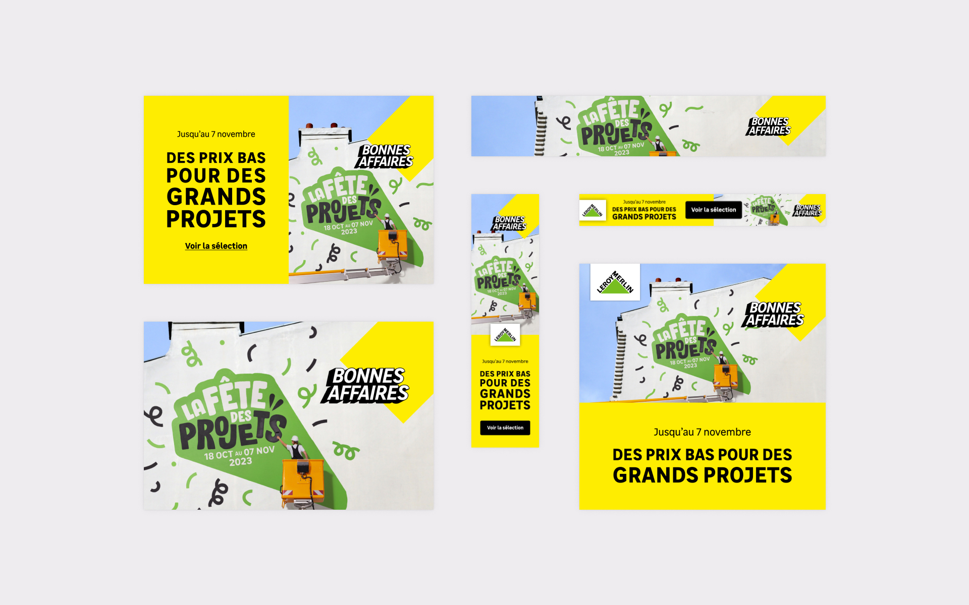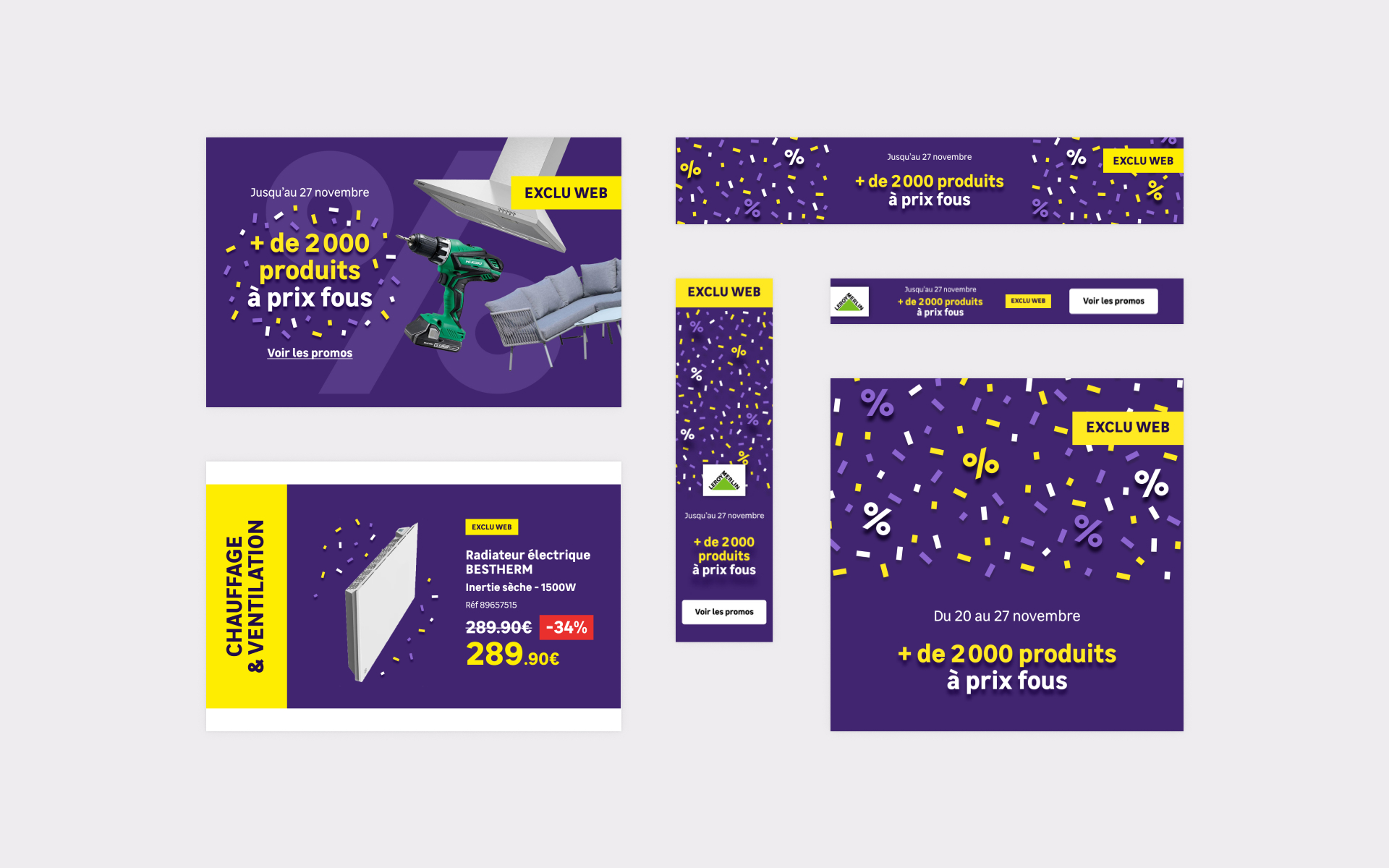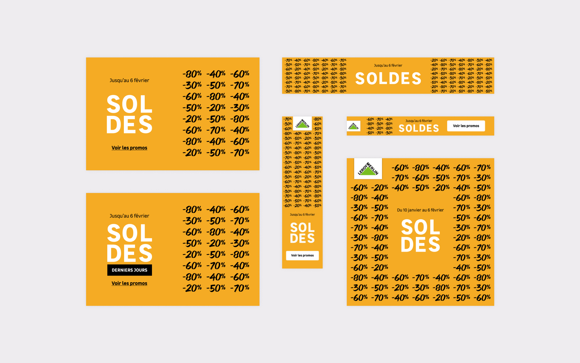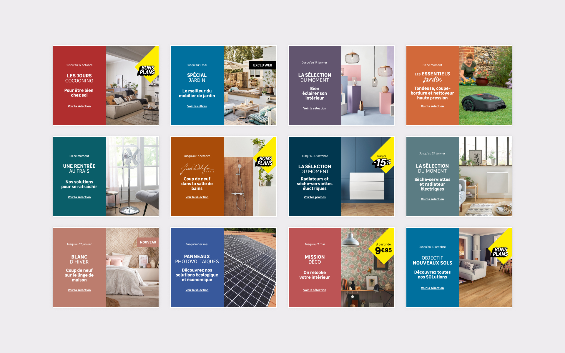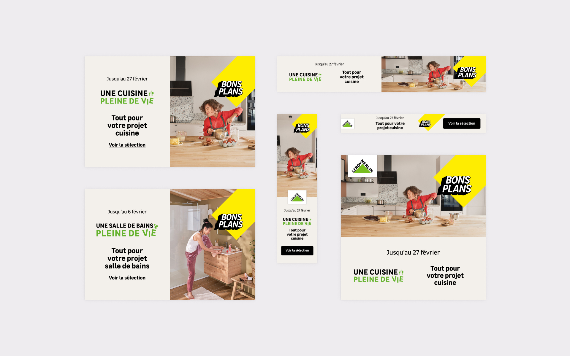 Mission longue durée chez Leroy Merlin (3 ans) : mise en place de la stratégie graphique des animations e-commerce, création de gabarits dynamiques et réalisation des opérations commerciales (soldes, temps forts, etc.).